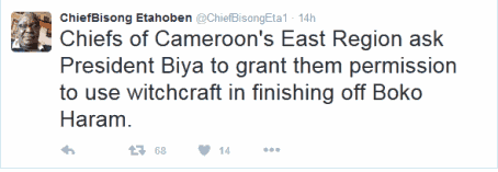 According to tweets from the Cameroonian journalist Chief Bisong Etahoben, Chiefs of Cameroon’s East Region requested President Biya to grant them permission to use witchcraft in finishing off Boko Haram.